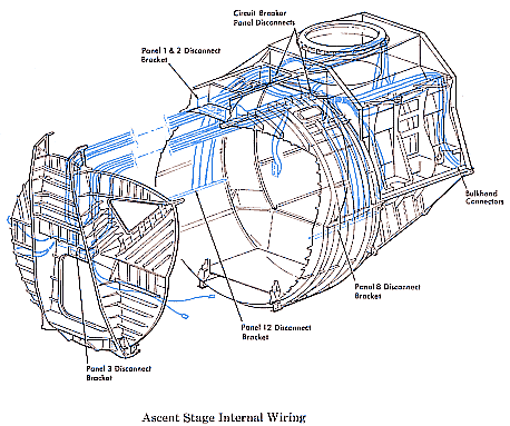 Included in the Electrical Power Subsystem are all the electrical harness and cable assemblies on the Lunar Module. The Ascent Stage has approximately 20 major electrical harnesses and 60 electrical cable assemblies. Shown are the internal wiring.