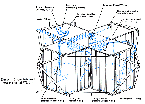 Included in the Electrical Power Subsystem are all the electrical harness and cable assemblies on the Lunar Module. The Descent Stage has approximately 5 major electrical harnesses and 45 electrical cable assemblies. Major harness and cable assemblies contained in the descent stage are shown .