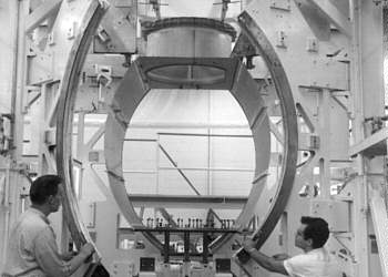 Mid section skins and lower deck assembly (LM-2) being aligned in welding fixure